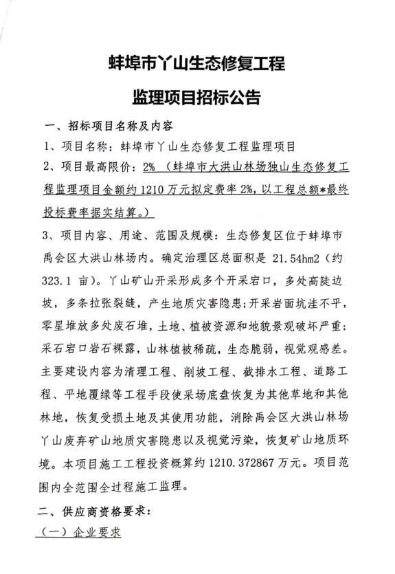 蚌埠市丫山生态修复工程监理招标公告