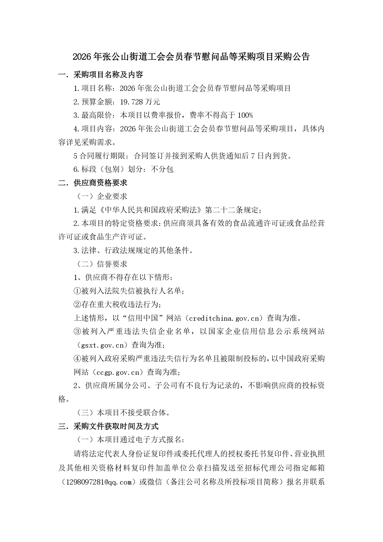 2026 年张公山街道工会会员春节慰问品等采购项目采购公告