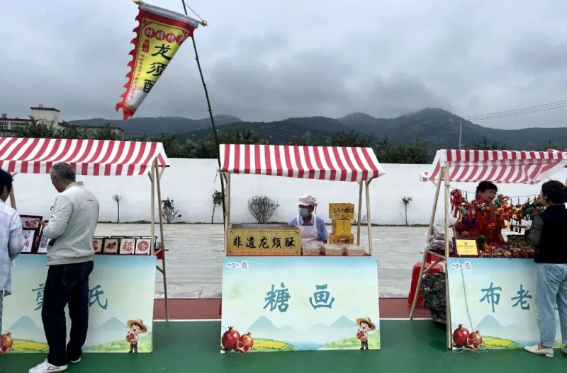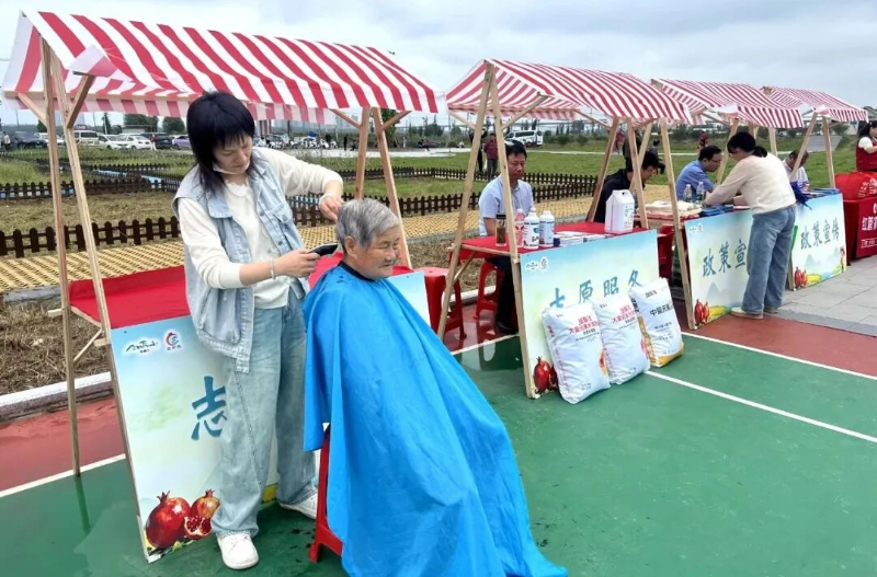 广场周边,烙画、泥塑、糖画、剪纸等本地非遗展示与多个涂山石榴展销台吸引了众多村民驻足,白花玉石籽、红玛瑙等优质石榴及石榴酒、石榴汁等涂山特色产品受到观众欢迎。志愿服务区同样人气十足,义诊、免费理发及政策宣讲等便民服务,让活动充满了暖意与人情味。
