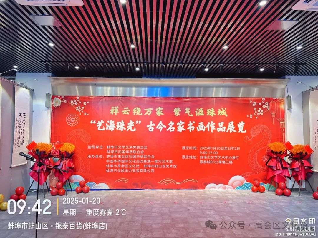 在蛇年新春来临之际,由蚌埠市文学艺术界联合会、蚌埠市归国华侨联合会精心指导,蚌埠市禹会区侨联、中国华侨国际文化交流基地——蚌埠市淮河艺术馆、禹会区文化馆等单位承办的“艺海珠光”古今名家书画作品展于1月20日上午在蚌埠市文学艺术联合会展厅隆重启幕。