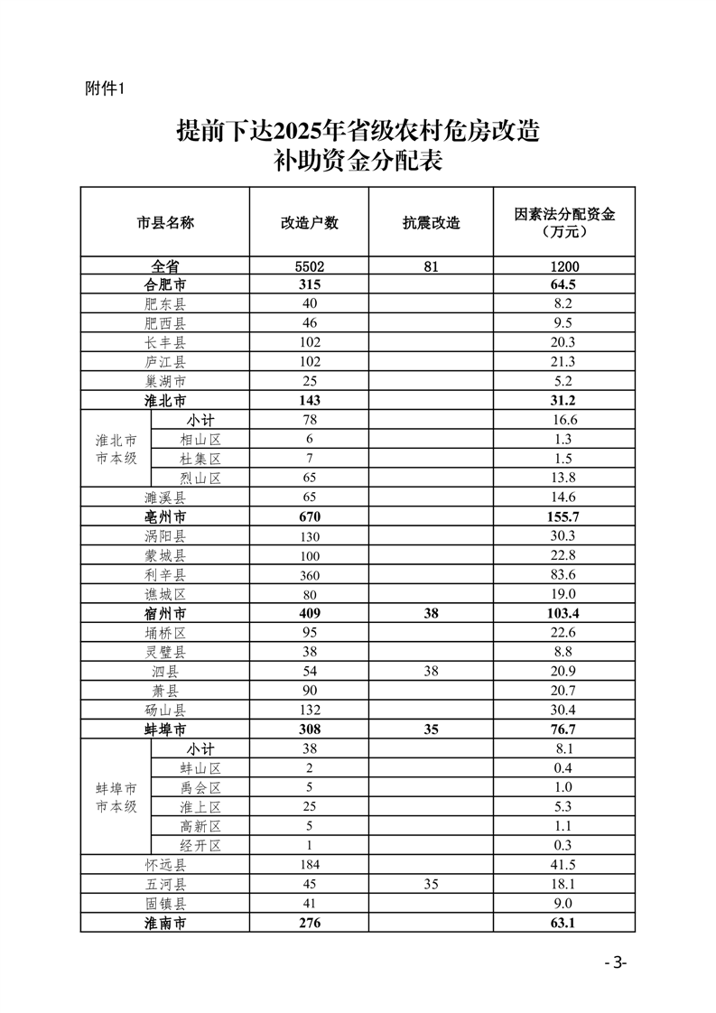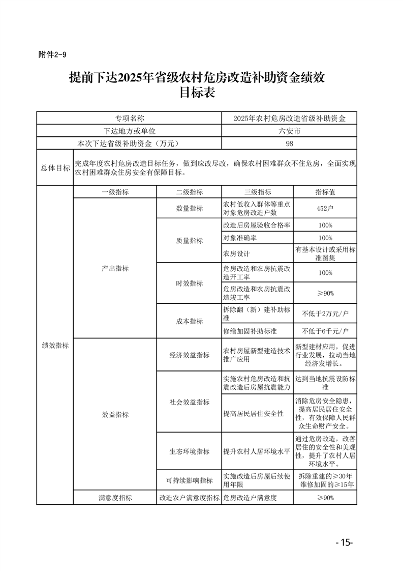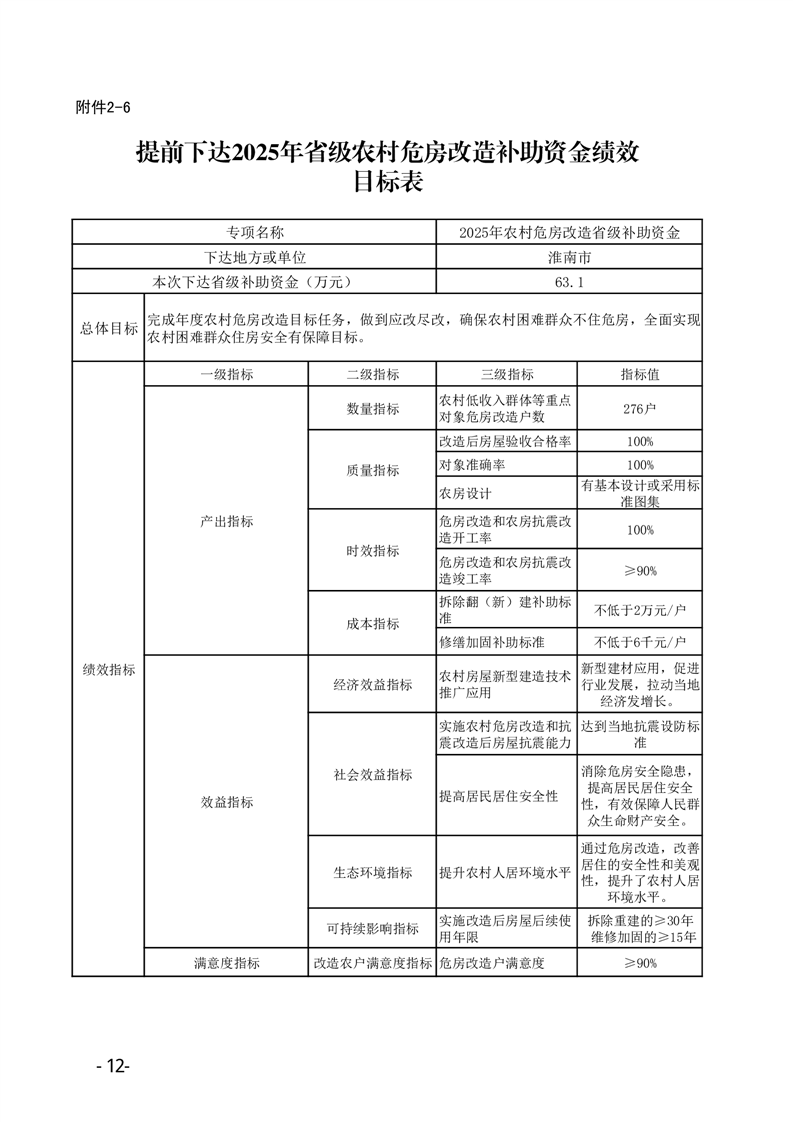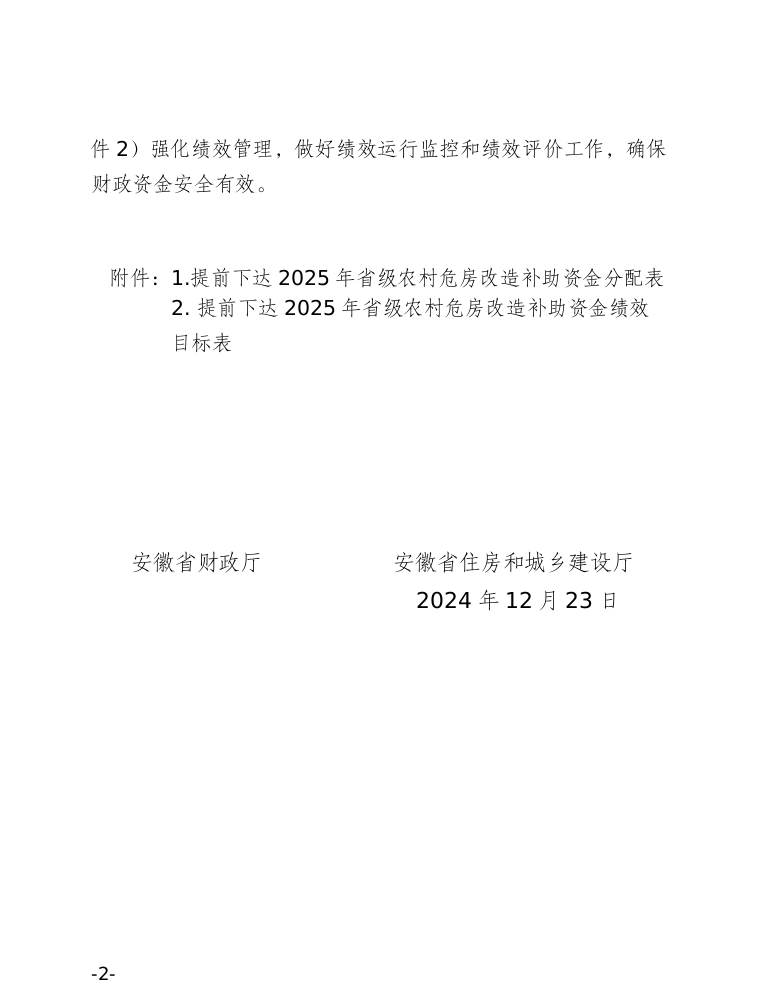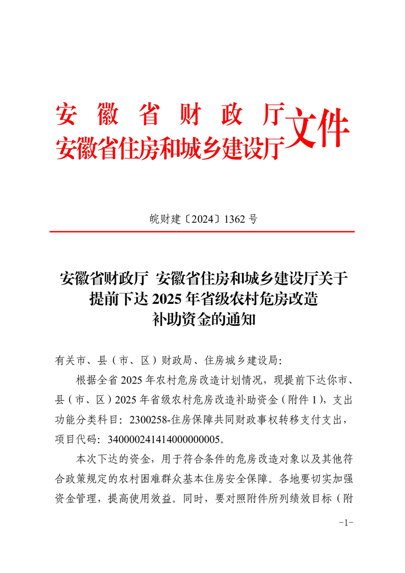 关于提前下达2025年省级农村危房改造补助资金的通知(皖财建【2024】1362号)