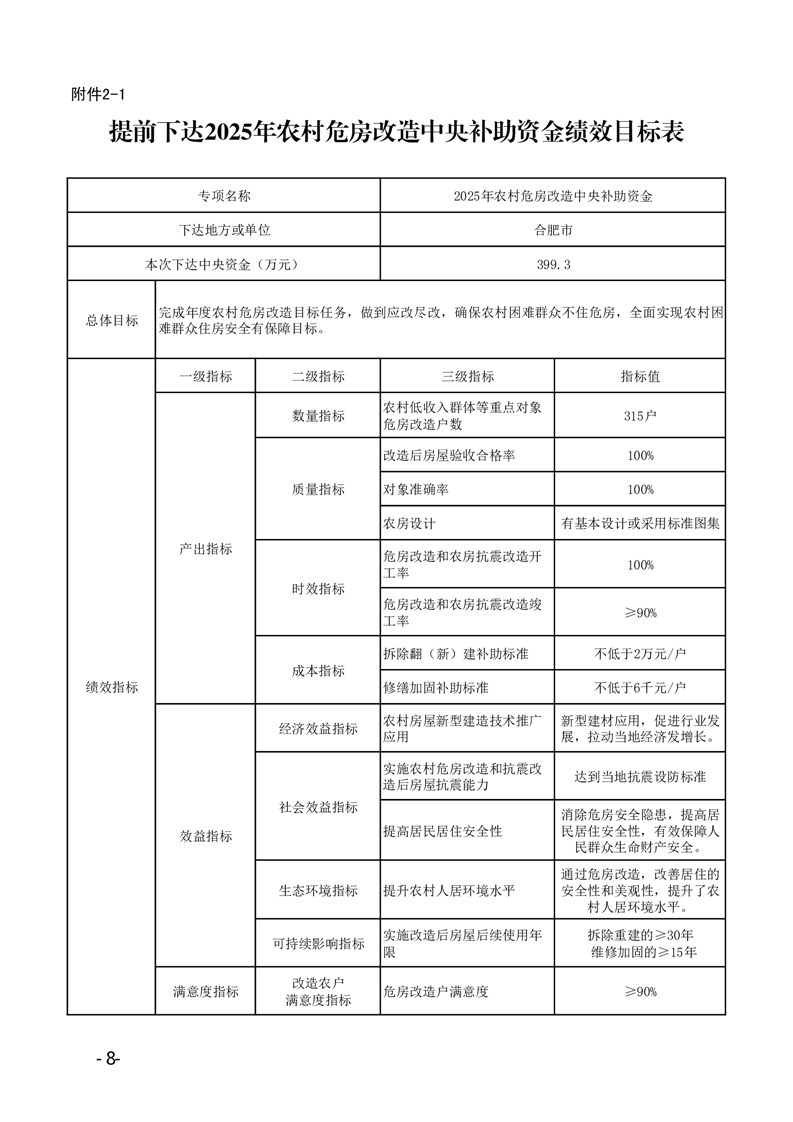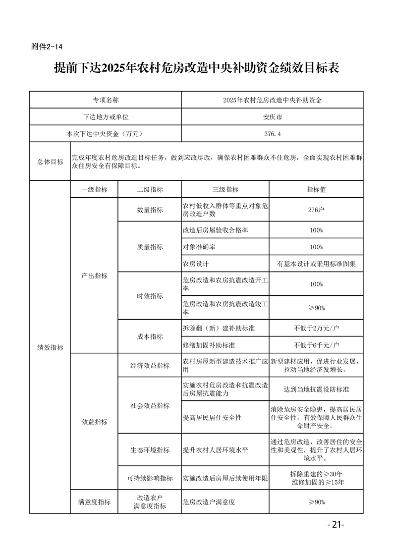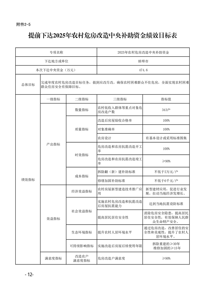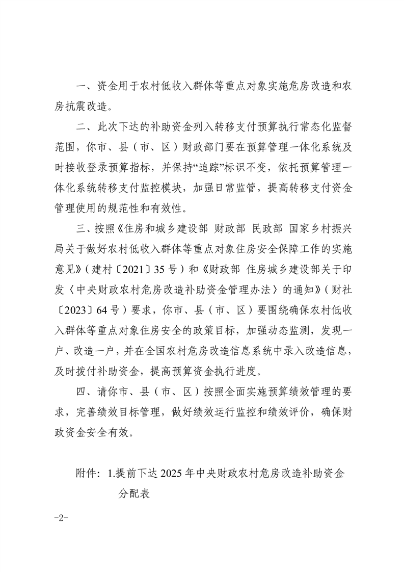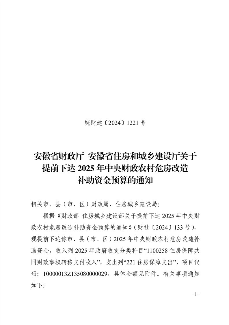 关于提前下达2025年中央财政农村危房改造补助资金预算的通知(皖财建【2024】1221号)