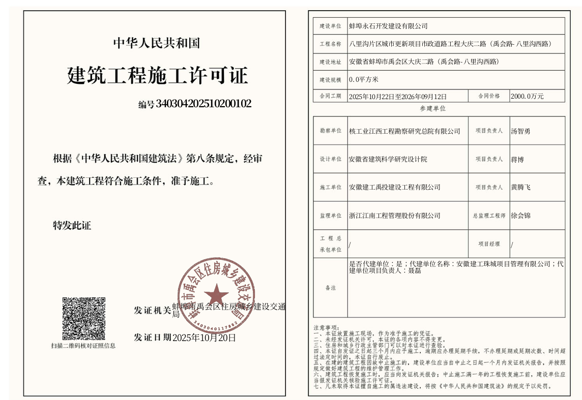 建筑工程施工许可证核发(八里沟片区城市更新大庆二路)(禹会路-八里沟路)