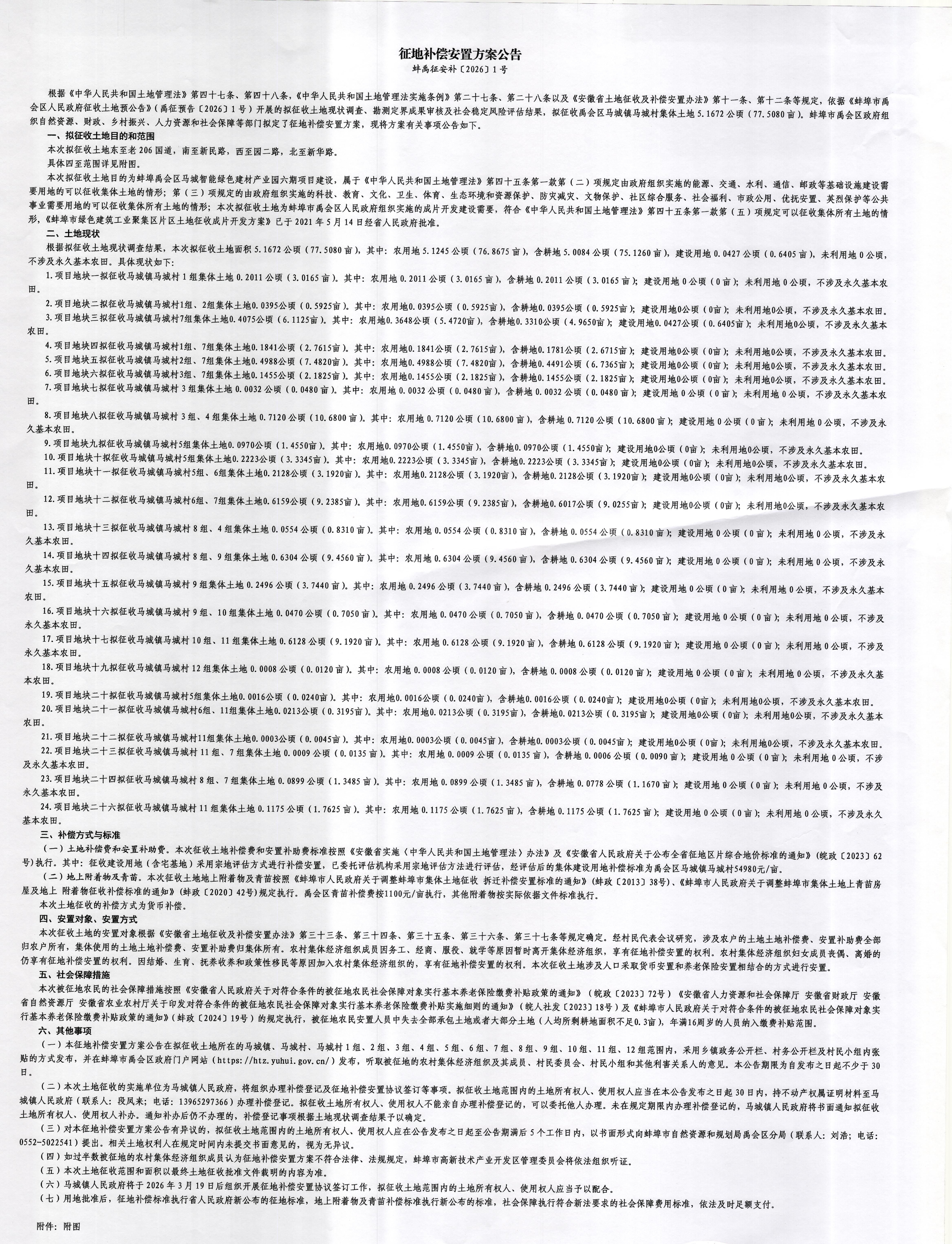 根据《中华人民共和国土地管理法》第四十七条、第四十八条,《中华人民共和国土地管理法实施条例》第二十七条、第二十八条以及《安徽省土地征收及补偿安置办法》第十一条等规定,依据《蚌埠市禹会区人民政府征收土地预公告》(禹征预告〔2026〕1号)开展的拟征收土地现状调查、勘测定界成果审核及社会稳定风险评估结果,拟征收禹会区马城镇马城村集体土地5.1672公顷(77.5080亩),现拟定如下征地补偿安置方案。