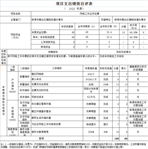 网格工作业务经费项目绩效自评概述:项目自评得分89分,全年预算数65万元,执行数32.4万元,完成预算的49.85%。
