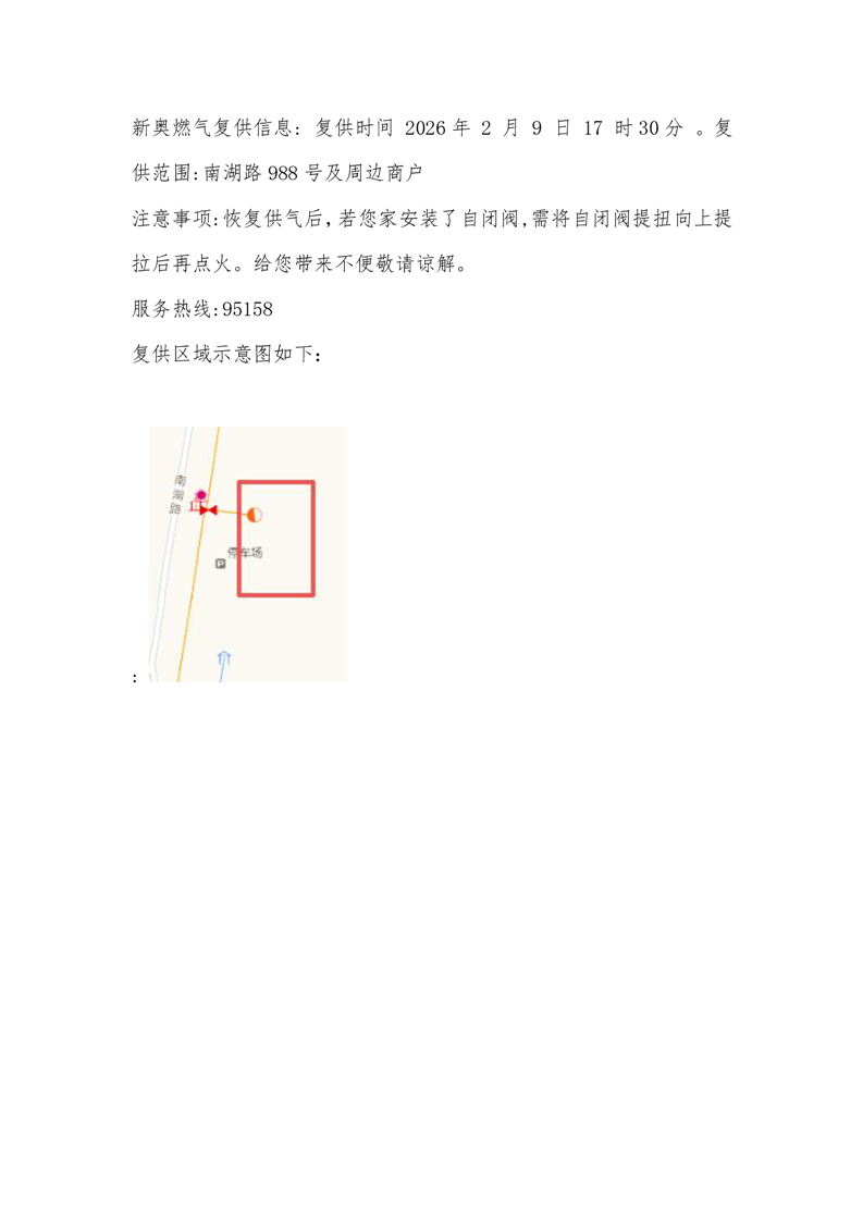 新奥燃气复供信息 复供时间 2026年 2 月 9 日 17 时30分 。复供范围: 南湖路988号及周边商户
