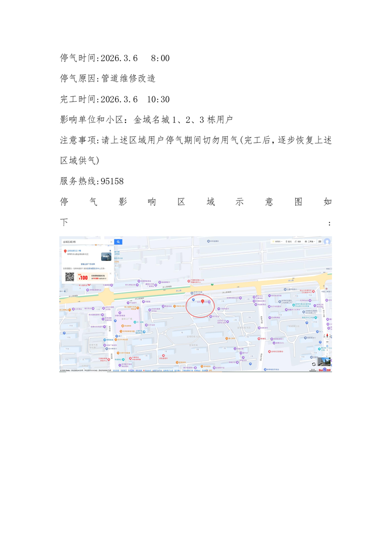 蚌埠新奥燃气停气通知:管道改造,计划2026年3月6日08时00分-10时30分期间停气。停气范围:金域名城1、2、3栋用户