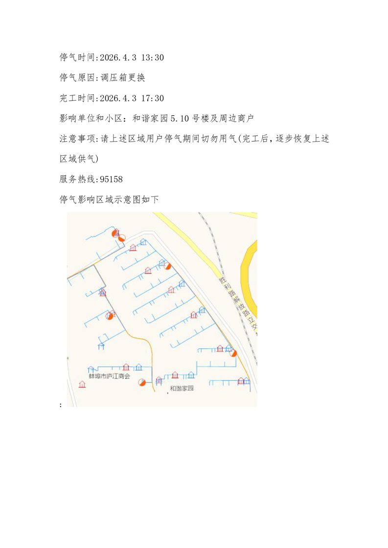 蚌埠新奥燃气停气通知:因调压箱更换,计划2026年4月3日13时30分-17时30分期间停气。停气范围:和谐家园5.10号楼及周边商户。