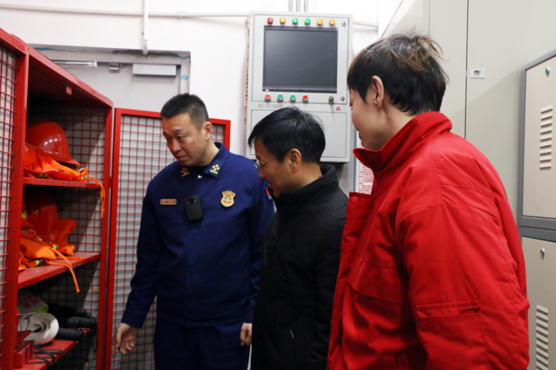 在荣盛时代广场,张斌仔细询问消防安全防范措施落实情况和消防设备运转维护情况,实地查看消防泵房,并现场测试消防水泵能否正常运行。