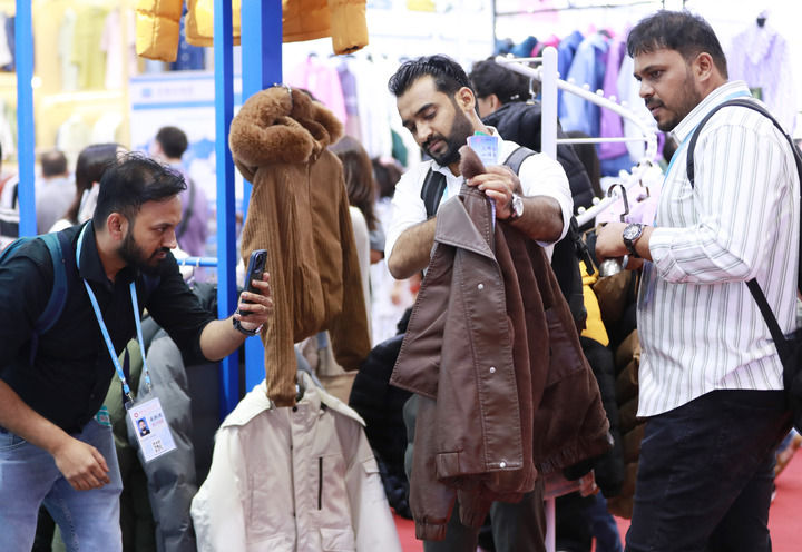 2025年5月1日,在广州开幕的第137届广交会第三期上,境外采购商在一家服装企业的展区拍摄样品。新华社记者 王瑞平 摄