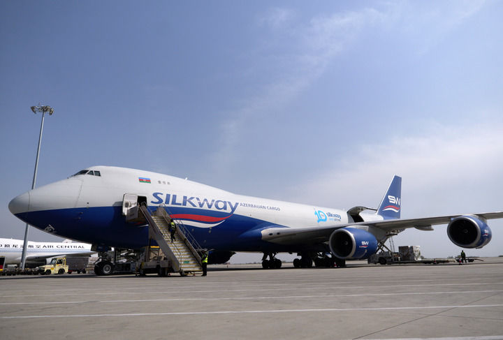 2025年4月2日,一架阿塞拜疆丝绸之路西部航空公司的货机停靠在郑州新郑国际机场停机坪上。新华社记者 李嘉南 摄